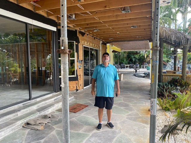 These projects focus on home renovations, featuring exposed wooden beams, open garage area, and unfinished rooms with exposed ceilings and bare walls. The images capture the process of home renovation, including outdoor patio with construction materials and tropical decor.